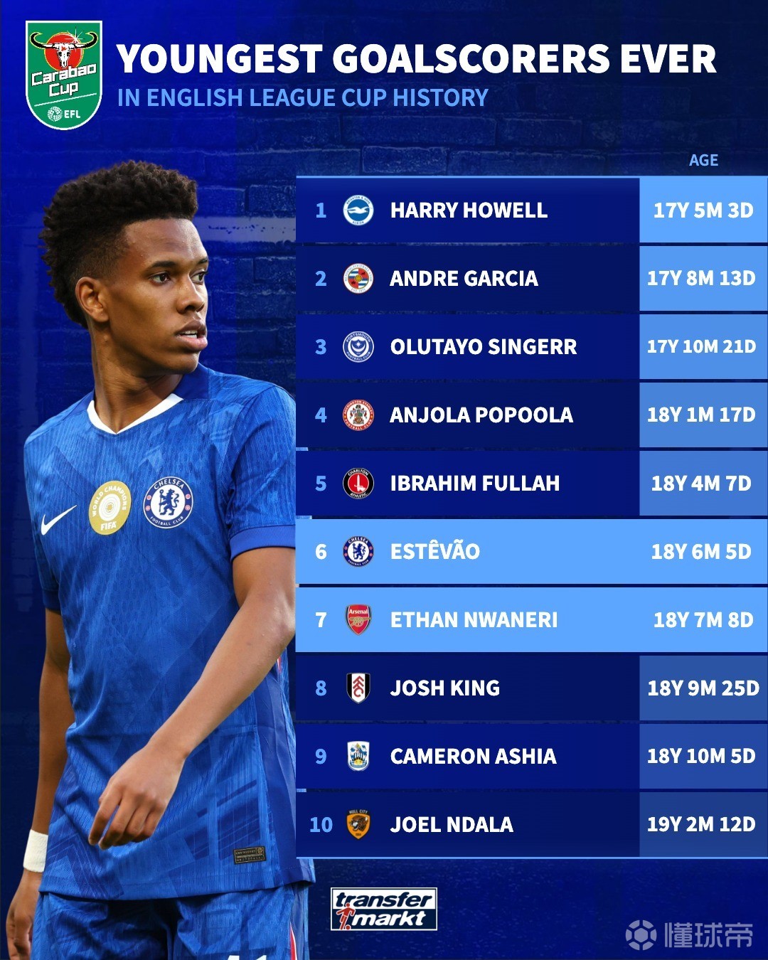 18岁,埃斯特旺与恩瓦内里排英联杯历史最年轻进球榜第6和第7